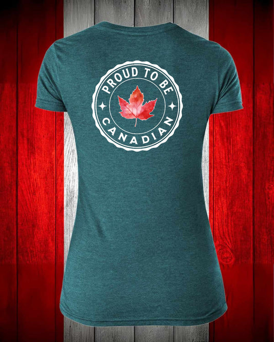 Proud to be Canadian leaf Left Chest And Full Back Women's V-neck Stanfield's Tee