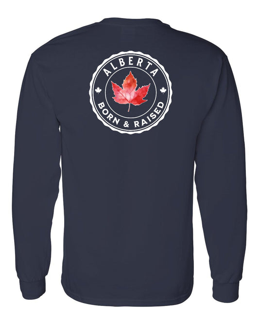 Born And Raised Alberta Left Chest and Back Long Sleeve - Gildan Canada (sewn Internationally)