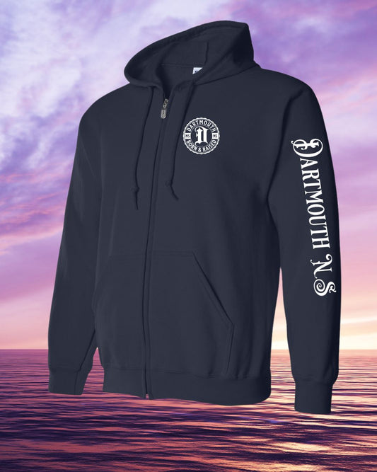 Born & Raised in Dartmouth left chest and sleeve Zip Hoodie