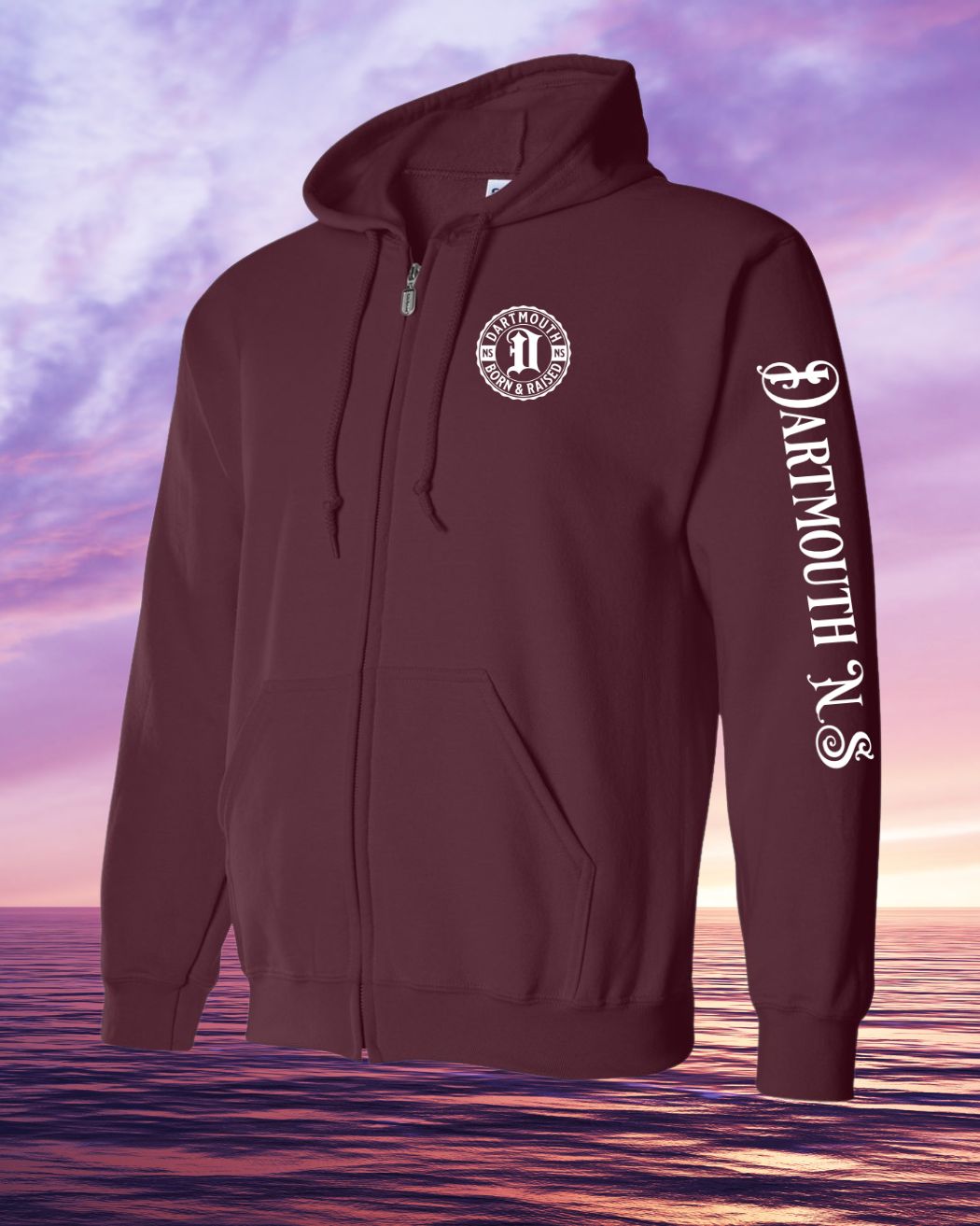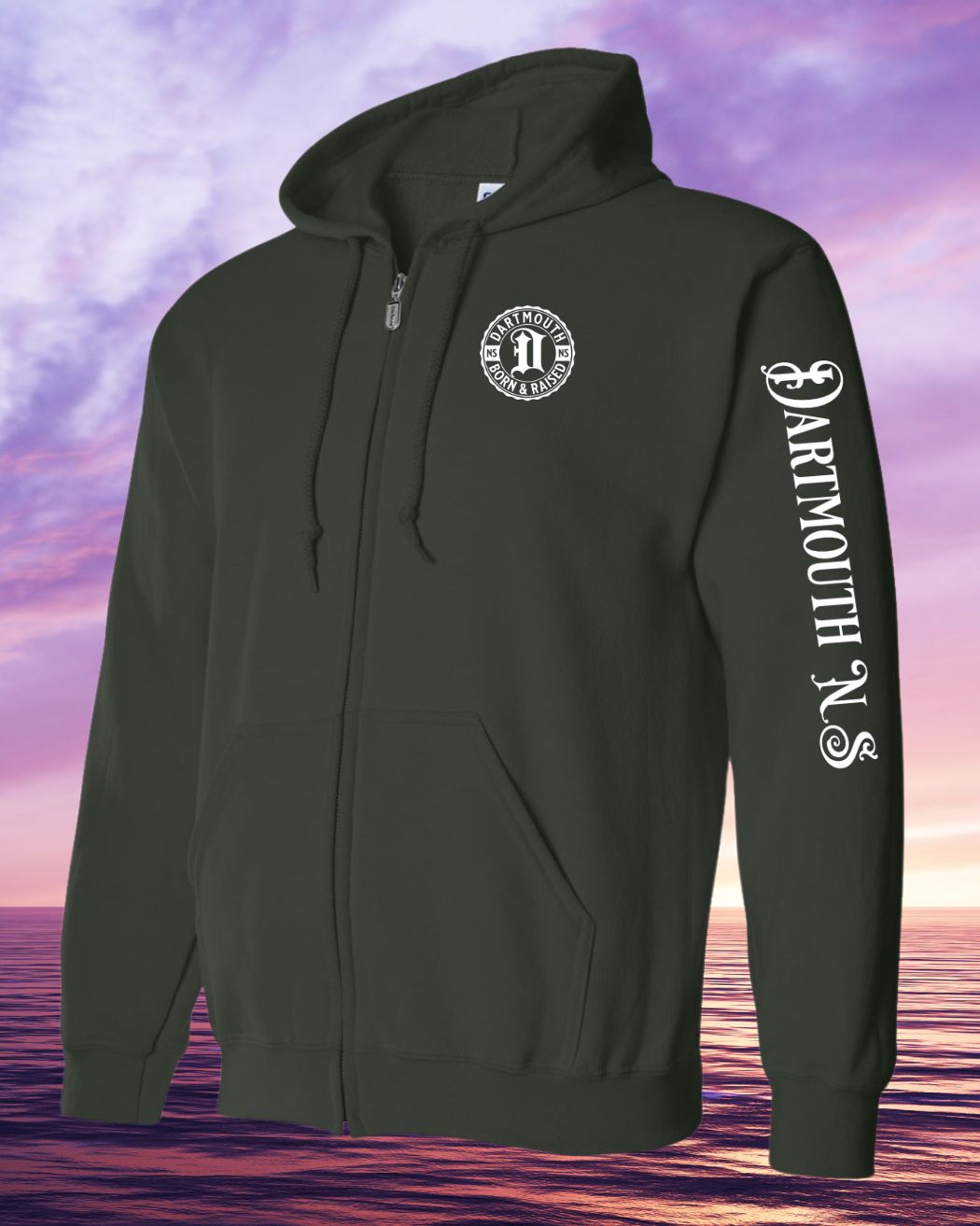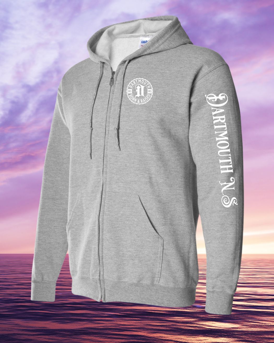 Born & Raised in Dartmouth left chest and sleeve Zip Hoodie