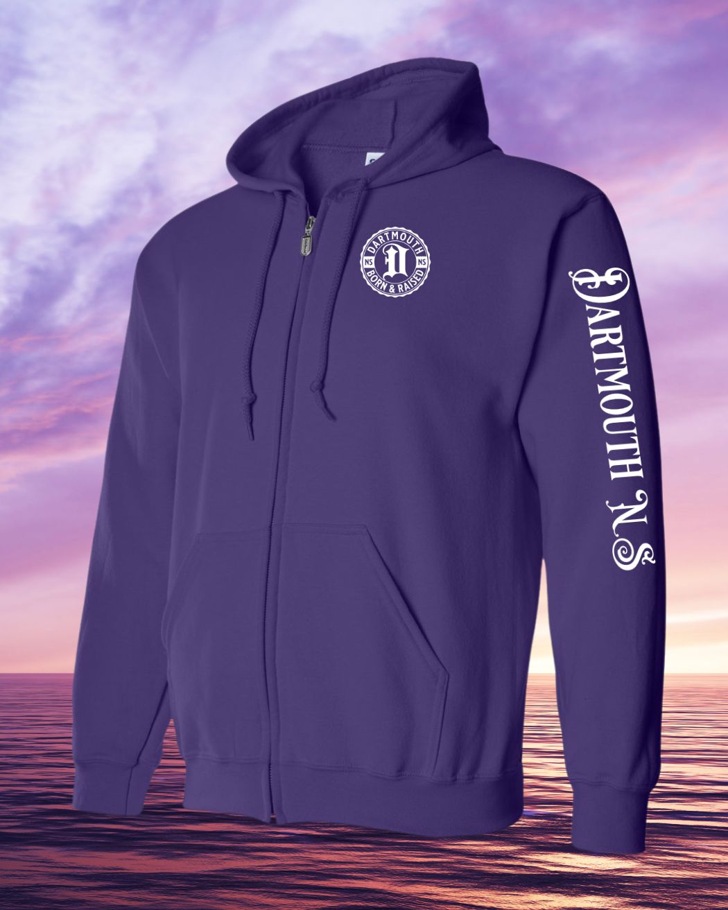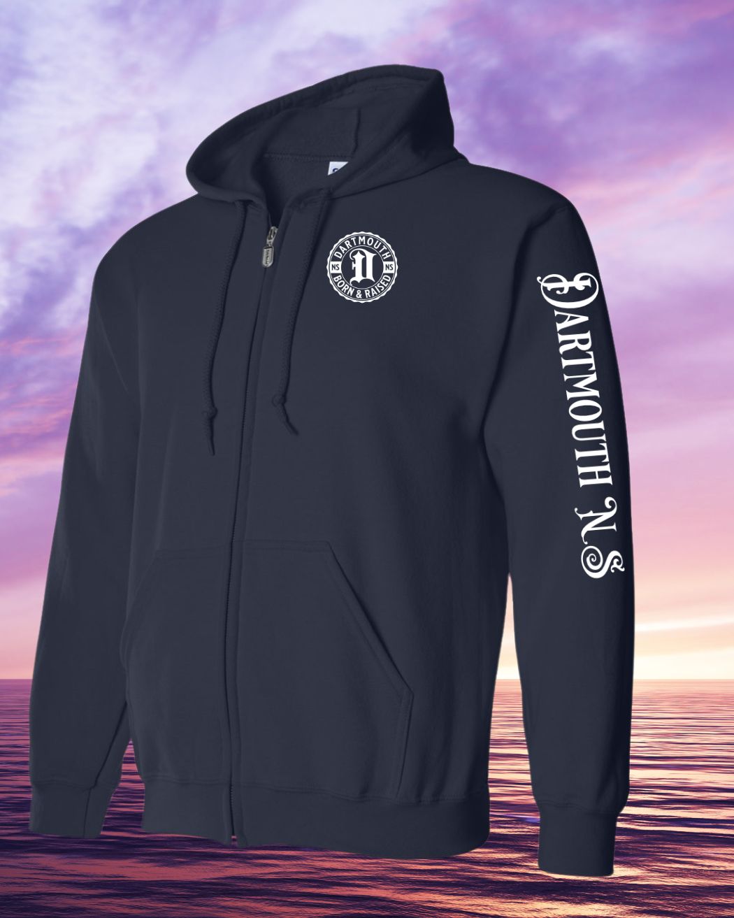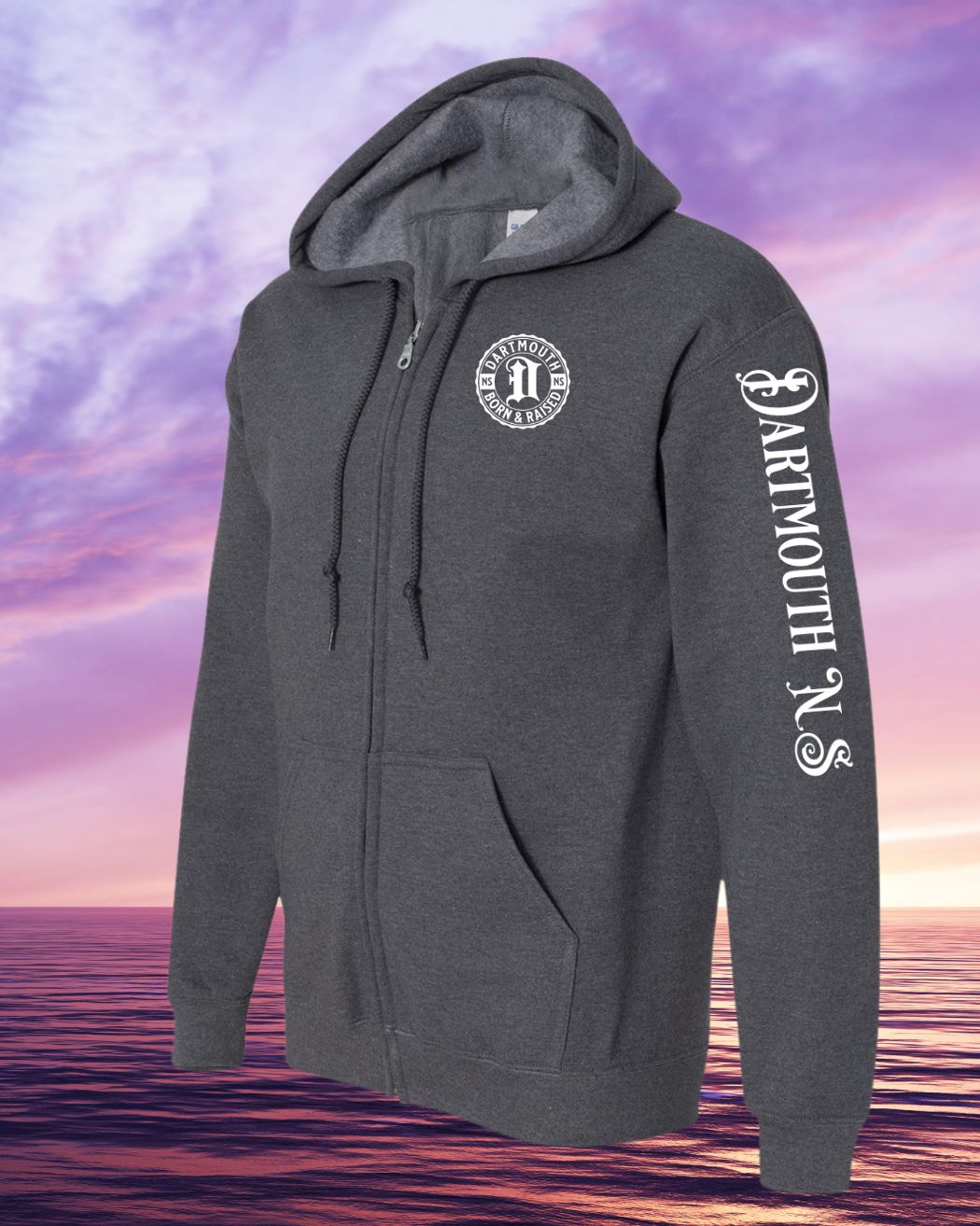 Born & Raised in Dartmouth left chest and sleeve Zip Hoodie