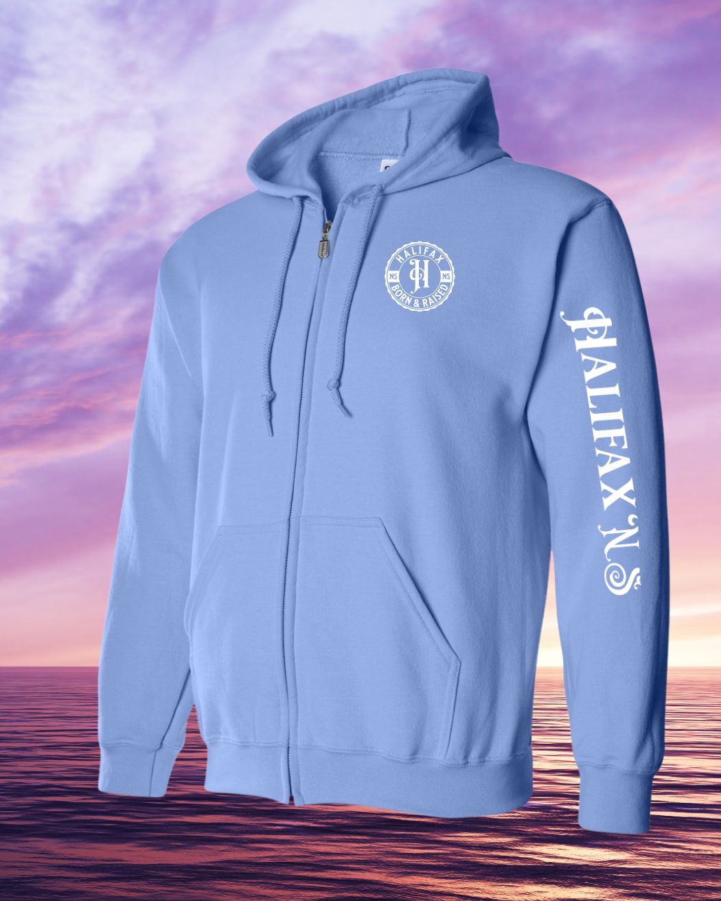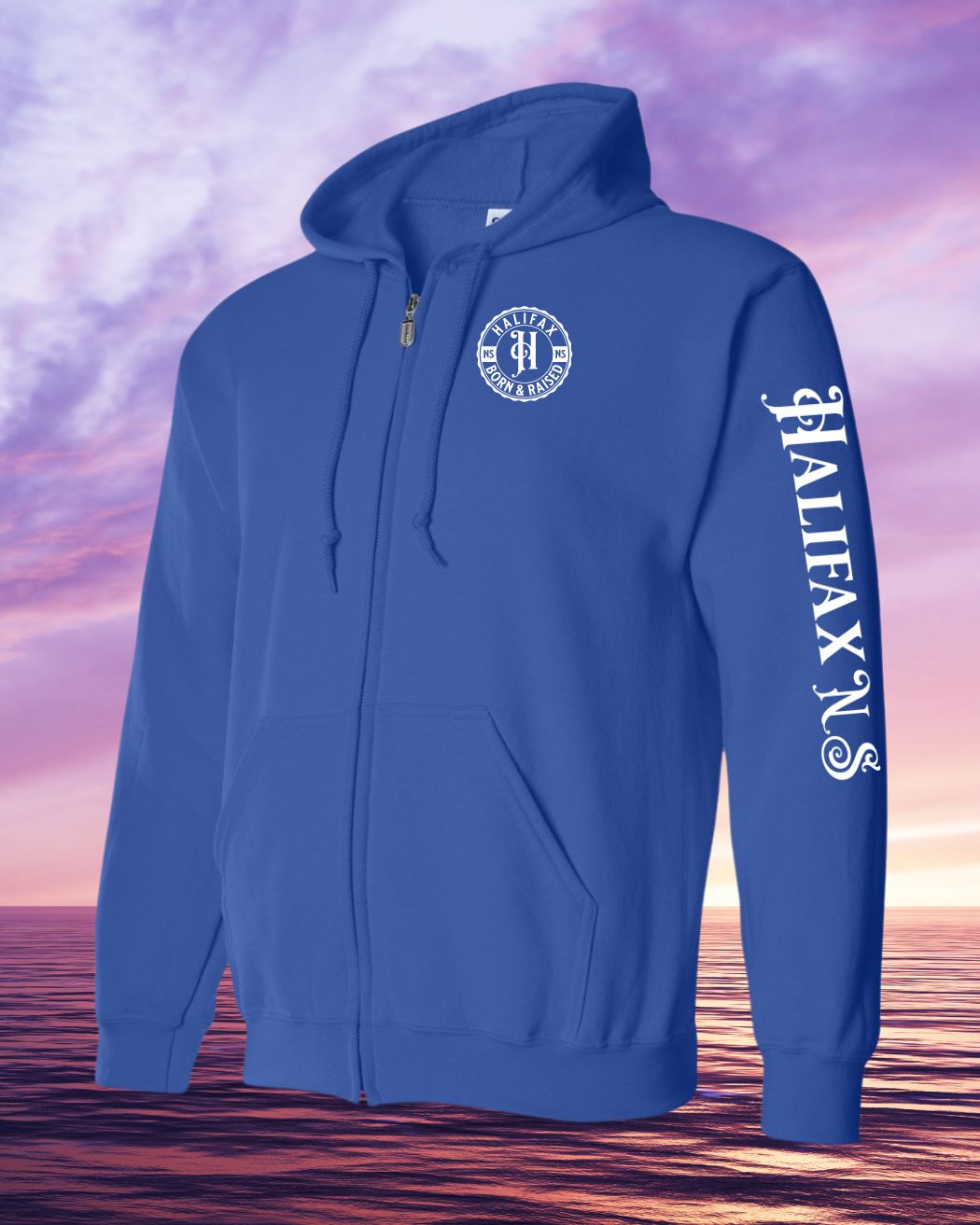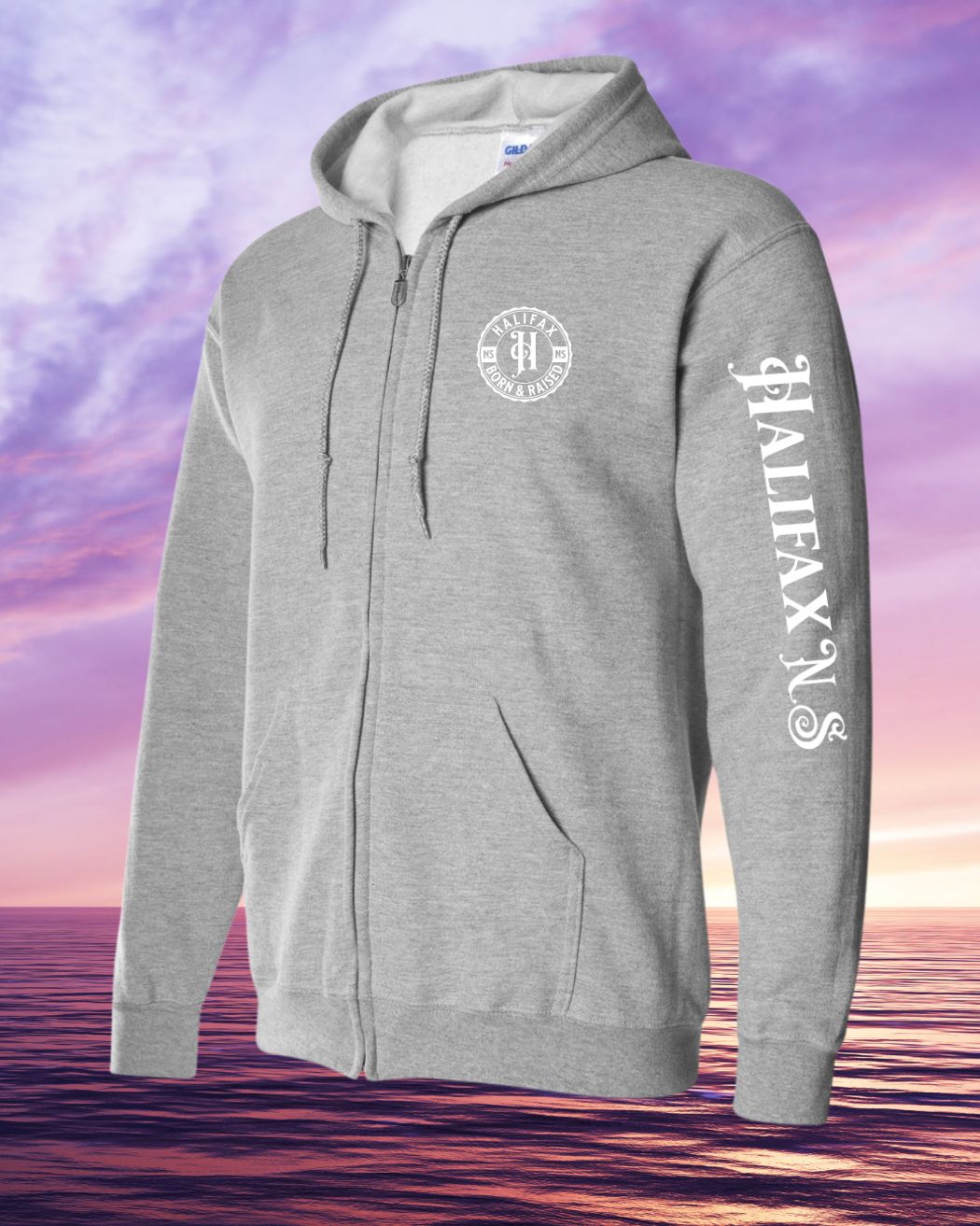Born & Raised in Halifax left chest and sleeve Zip Hoodie